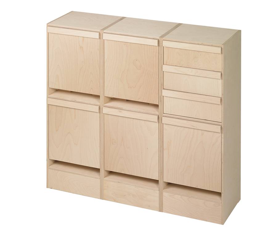 Containers are supplied assembled and ready to use. To save space, a compartment always consists of two units, one placed on the other. It is possible to set up compartments in several rows, one next to another. One tilted-out unit can be replaced by three smaller drawer containers.