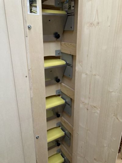 Die Drahtgitter sind so angeordnet, dass die Stäbe von vorne nach hinten verlaufen, dies verhindert, dass sich der Kot auf den Gittern festsetzt. Die Regale sind standardmäßig 5 Reihen übereinander gefertigt und unten mit einer aufklappbaren Sockelblende versehen.